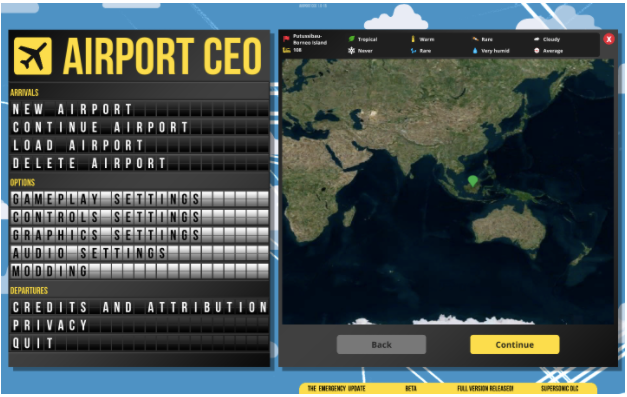 Airport CEO provides a lot of customization from the ability to create your own CEO character with a variety of face, eyes, nose, mouth, etc., options to choose from to the name, logo, and placement of your airport. I thought it was cool how the game essentially lets you build an airport anywhere you want, even in bizarre places and provides details about the selected location.