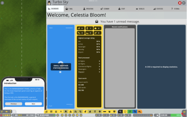 As the CEO, you also have access to emails, contracts, airport analytics, staff employment, flight schedules, and basically anything you would need to operate a real airport on the business side. The ultimate goal is to craft and manage the most successful airport.