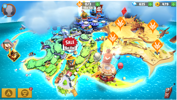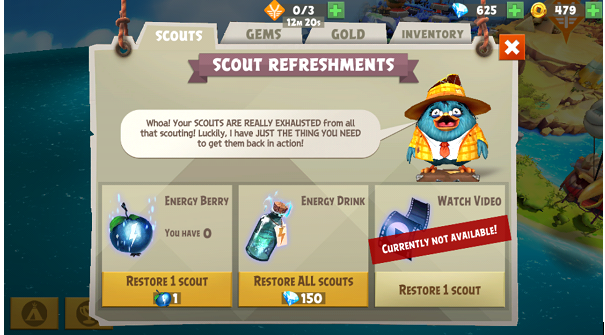 The one aspect of this game that I found frustrating is the Scout Missions. Sometimes in order to advance to the next battle, you must go off on side missions to collect random supplies—bandages, matchsticks, marshmallows, etc.—by winning smaller pig fights elsewhere on the map. The random supplies are usually tied loosely to the main story line; for example, you get “injured” when a volcano erupts near you, so you have to go find bandages and first aid kits. However, in order to locate and unlock the extra pig battles, you must use one of the three Scouts in your possession. Unfortunately, once you use a Scout, it takes 20 minutes to gain one back, and sometimes I had to use all three in under 20 minutes. This meant that I had to wait 20 minutes to an hour just to continue the game. There are some ways to get your Scouts back, but they either cost a lot of precious gems or will only work once every 24 hours. It definitely tested my patience to simply watch the minutes tick by, and sometimes it discouraged me from playing at all.