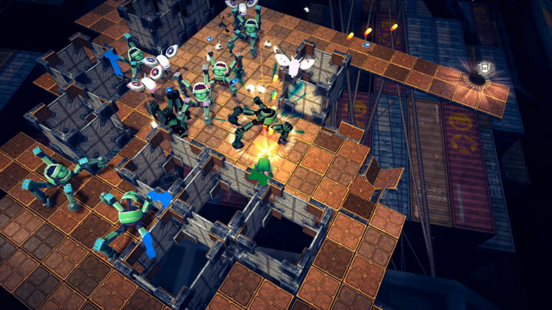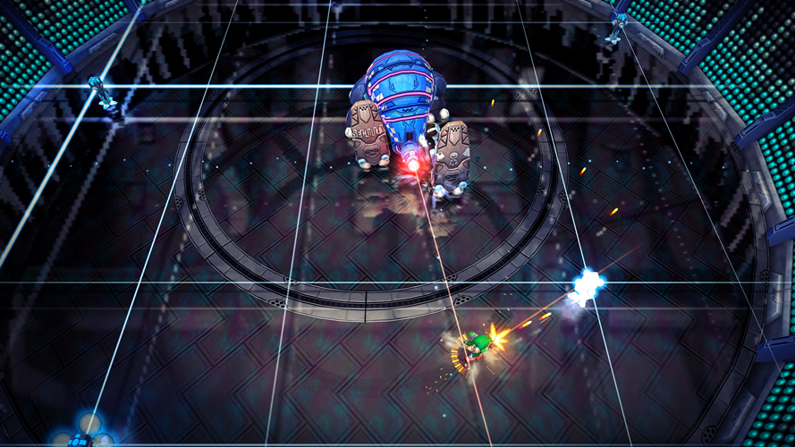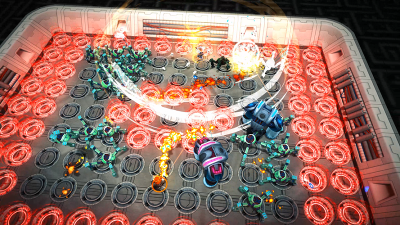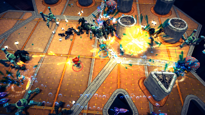 Weapon loadouts vary wildly between characters. Coral, a tough security officer, carries a Shotgun and Plasma Pulse that have a huge damage output in close-range; while another character like Starch has a screen length Laser Beam and heat-seeking Micro Missiles that make her deadly at long and medium range. The choice between range of weapons isn’t the only differential trait between character loadouts however; there are some crazier weapons like Aubergine’s dual-rotor drone controlled by pumping the right trigger, and Peanut’s lava gun that only shoots at an arc. These kinds of weapons really mix-up the moment-to-moment gameplay and can seem a bit awkward at first, but it’s interesting to see these kinds of weapon behaviors in a genre where most weapon handling is straightforward. As you mow down hordes of robots you, powerups in the form of speed boosts and extra firepower will drop frequently and can change into different temporary boosts depending on how long it takes you to pick them up. The loadouts between each character are astoundingly diverse and are especially fun to see when playing 4 player co-op. I was able to have 3 other friends try the game with me; particle effects filled the screen, robots seemed to pour out of every corner of the level, and most impressively the framerate kept pace with the kinetic action on screen.