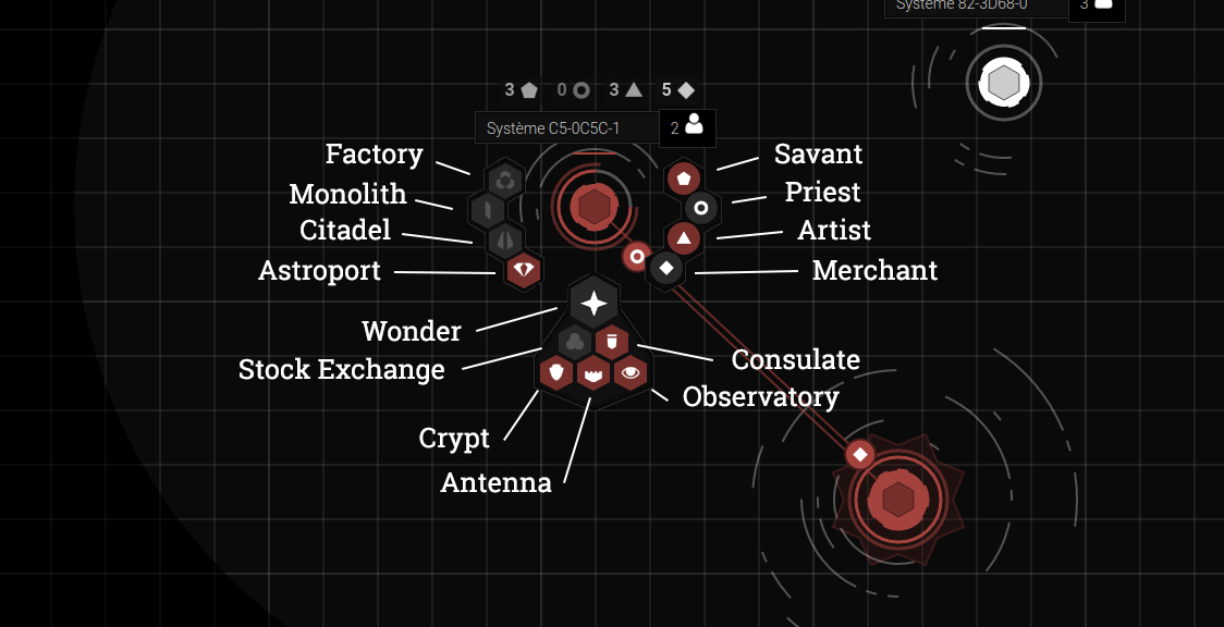 The player can build a single building per solar system. Different types of buildings give different type of bonus, be it points or credits to progress in the current mission. Great Characters have a cost in characteristics points and credits. So the player has to manage his buildings well to produce the needed points, credits and benefit from the different useful bonuses.