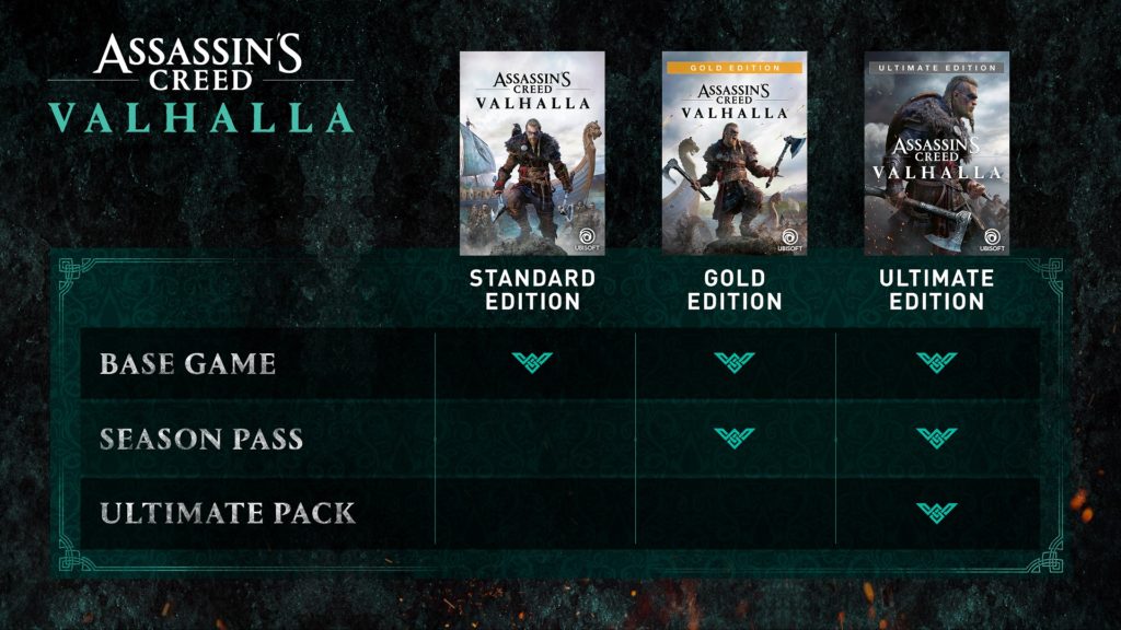 - The Ultimate Edition will include the base game, the Season Pass and the Ultimate Pack, giving players access to exclusive customization content: the Berserker Gear Pack, the Berserker Settlement Pack and the Berserker Longship Pack, along with a Set of Runes to improve weapons or gear.