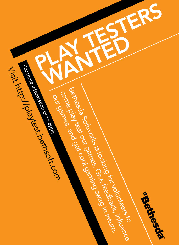 Specifically, the ad states “Bethesda Softworks is looking for volunteers to come play test our games. Give feedback, influence our games, and get cool gaming swag in return.’