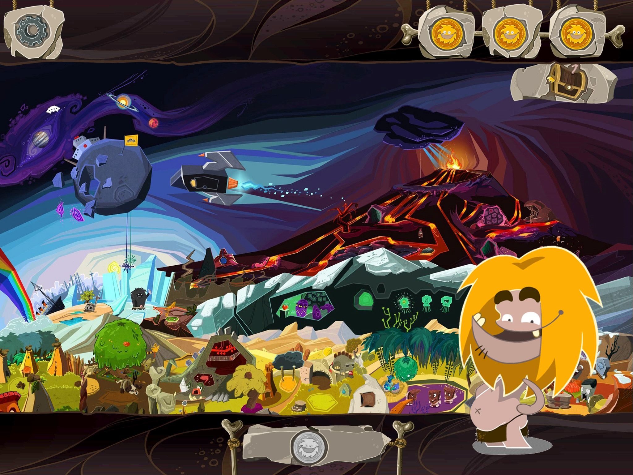 The player has to help the clumsy Ungh find his way through the prehistoric world. Because he let the campfire go out, his tribe has ordered him to find new fire. From that point on, he must solve tricky tasks and creatively overcome challenges in his search for that most important of elements. He uses tools such as mammoths and all sorts of other beasts as well as Stone Age items. During his quest, he will meet bats and dinosaurs and explore the steppe, the jungle, and even the interior of a volcano. Whether or not he is ultimately successful depends entirely on the player’s puzzle skill.