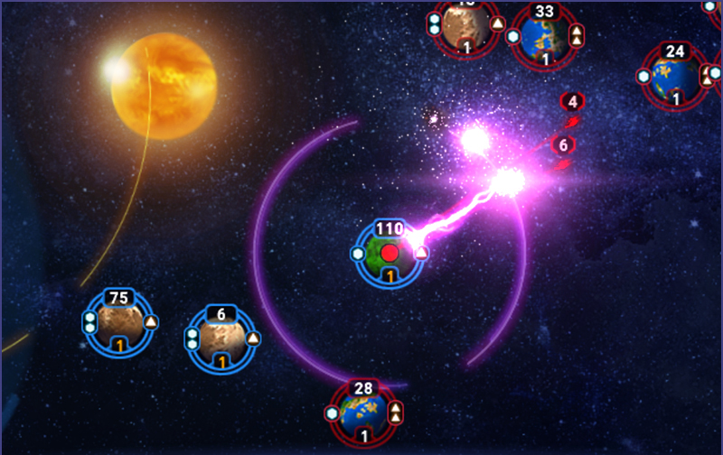 Click and drag with the left mouse button, and you’ll send all the fighters to a planet within range; use the right button, and you’ll send half of them. If you have more fighters than the target planet, you’ll conquer the territory and get that planet’s resources … as long as you control it with superior numbers of fighters.