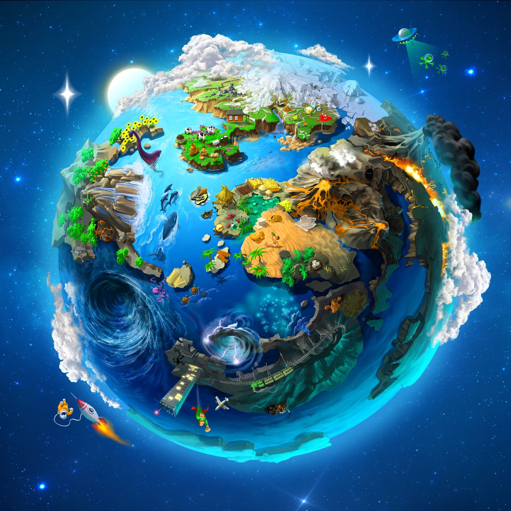 - Utilize fire, wind, earth and air to create a personalized Universe