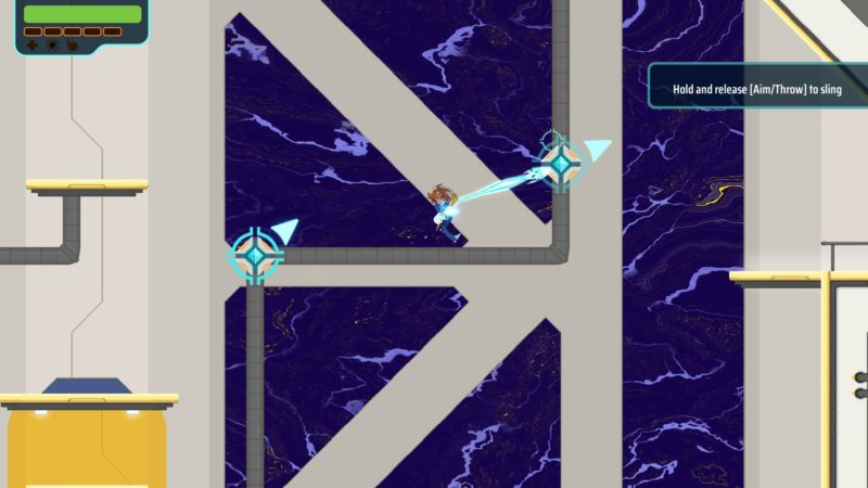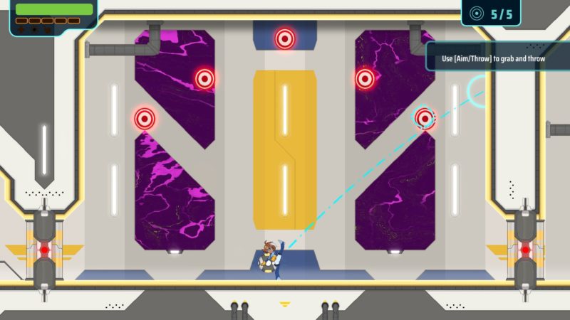 One additional thing that the game adds is a grappling hook. The grappling hook is a tool that your character possesses and can be used throughout the game. The grappling hook can be used to slingshot your character from certain objects as well as to grab physical projectiles out of the air and throw them at any enemy, not just the one who shot the projectile. Additionally, time slows down for a few seconds while you are aiming, something which proved to be a lifesaver as the later levels have entire sections where you have to use a series of grappling hooks to cross a bottomless pit or some type of floor hazard. The 2nd and 3rd levels of the Goo universe are particularly merciless with this.