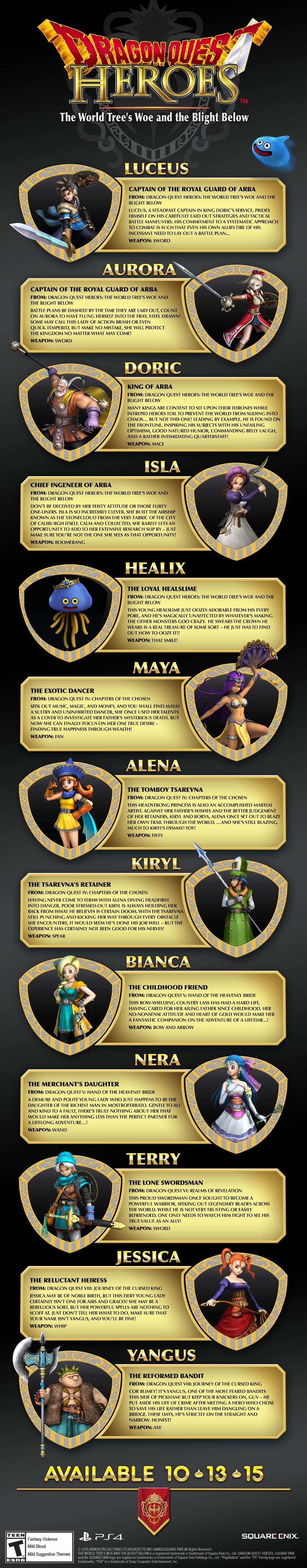 LOS ANGELES (Oct. 2, 2015) – SQUARE ENIX today released a new infographic for the upcoming DRAGON QUEST HEROES®: The World Tree’s Woe and the Blight Below, giving DRAGON QUEST players old and new an in-depth look at the main characters, their background and even weapon of choice.