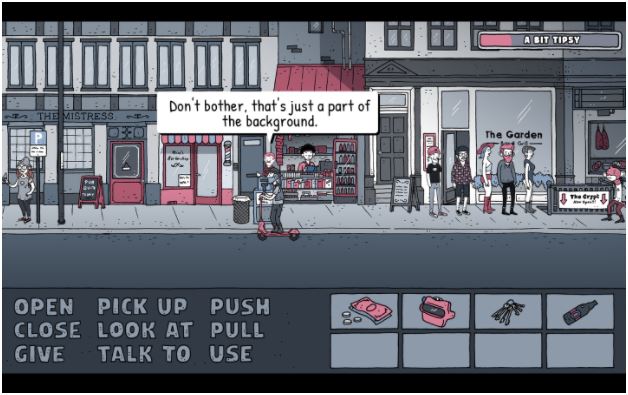 Dude, Where Is My Beer? has its own beer-o-meter located in the top right corner. As you explore, you come across many different kinds of bars like a sports bar, a dive bar, a rock bar, etc., that each have their unique craft beer creations. Of course, they’re not pilsners so the MC will not be satisfied but a couple cans of beer are necessary for the MC to be able to talk to people. Good thing you can just continue to go to a bar and get another beer. Money is not a problem in this game. Over time, you get less tipsy and some puzzles can only be completed when you’re sober.