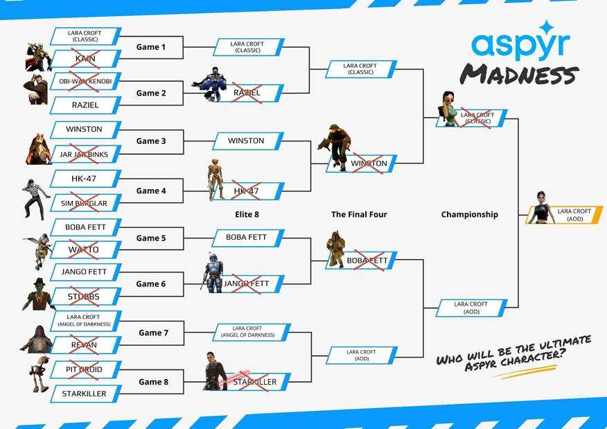The results of our first-ever Aspyr Madness tournament are in, and Lara Croft (Angel of Darkness) has formally declared herself the Ultimate Aspyr Character following an exciting bracket full of intense fan-favorite matchups!