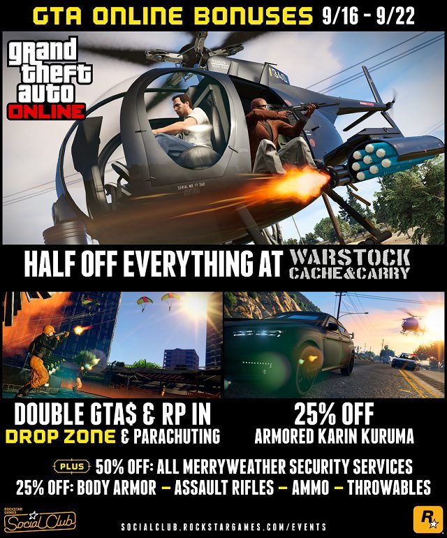 Today Rockstar Games are happy to announce a weekly refresh of bonuses and discounts in GTA Online, including Double GTA$ & RP in all Parachute Jobs and the Drop Zone Adversary Mode. Also this week, Warstock Cache & Carry is cutting prices with half off its entire inventory of military and utility vehicles. Merryweather is also getting in on the action with half off their full range of services. Plus there’s 25% off the Armored Kuruma and a bevy of discounts at all Ammu-Nation locations.