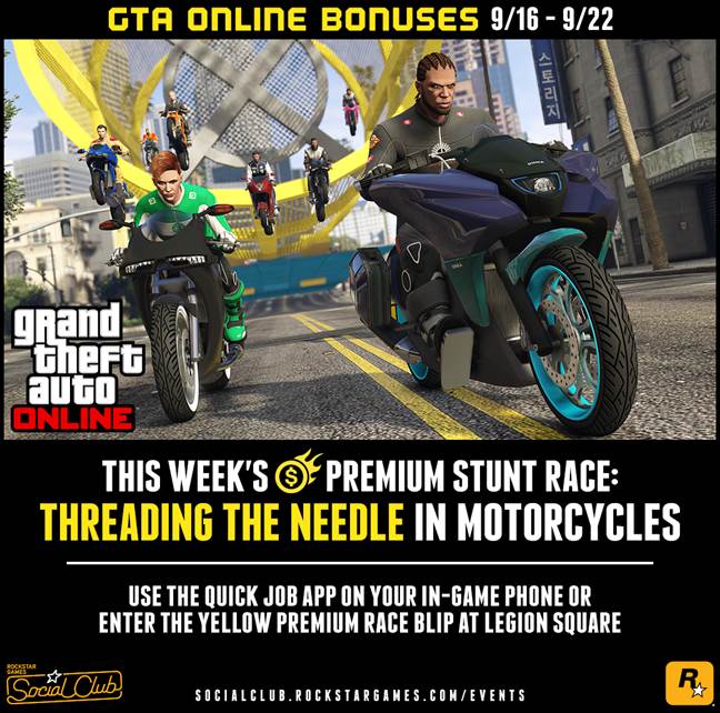 Players can challenge themselves in the tight and technical “Threading the Needle”, this week’s Premium Stunt Race in GTA Online. Locked to Motorcycles, this Race is just over 3 miles of track and will require intense focus so crack open a Sprunk and saddle up. GTA$ payouts await the top three finishers, along with Triple RP for all who enter. Players can head over to the yellow Premium Race Blip in Legion Square all this week or enter via the Quick Job App to get your engines revving.