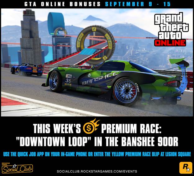 This week’s Premium Stunt Race features the popular “Downtown Loop”, and is set to the Banshee 900R. True to its name with a series of loops, corkscrews and jumps set in downtown Los Santos, this Premium Stunt Race features payouts for the top 3 finishers and Triple RP for all participants. To hop right into the high-stakes action, enter via the Quick Job App or visit the yellow Premium Race blip at Legion Square.
