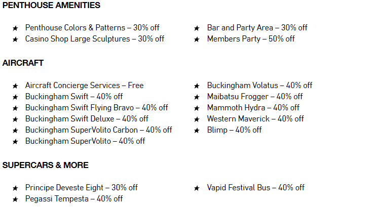 Between the rooftop soirees and corporate subterfuge, find some time to take advantage of 40% off a selection of helicopters and other aircraft, as well as sales on the ferocious Principe Deveste Eight, Penthouse customization options and more. Full list of discounts below:
