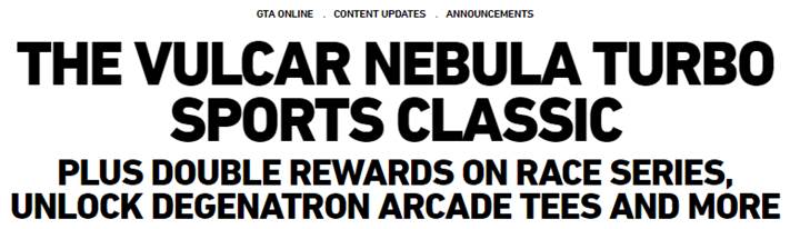 Rockstar Games is happy to announce that this week, GTA Online’s new Vulcar Nebula Turbo Sports Classic hits Southern San Andreas Super Autos, with Double Rewards available in the latest Race Series, featuring the recently released tracks; Scenic Route, Rancho Rivalry or Grapeseed Circuit.