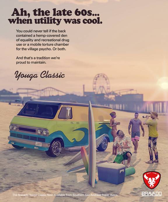 Pick up the pinnacle of authenticity and counter-culture, the Bravado Youga Classic from Southern San Andreas Super Autos. A true utility vehicle, this beach-bound beaut with high suspension will keep them all wondering what’s going on in the back.