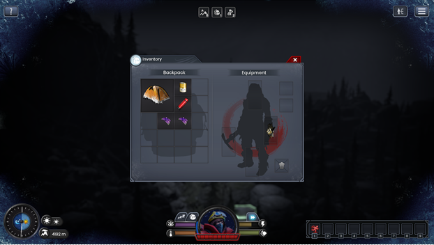 The terrain of the mountainous game world is built in hexagonal sections that you can travel across, which lends a unique board-game-like feel to the game. There are different kinds of tiles- snow, ice, and rock- which can affect aspects of the game such as how much energy it takes to traverse them or the speed at which you travel. Some tiles trigger different types of events when you walk across them, such as encounters with natives, discoveries of ancient shrines, or even dangerous rockslides. Each event is played out in an interactive text-based form. It feels a bit like reading a story- much of the imagery is left up to the player’s imagination, which can be fun, but also may not be appealing to every player.