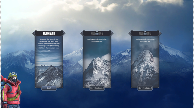 As a player, you can interact with the game in two main ways. One way is the path you travel. You can choose which tiles to cross depending on the danger, energy cost, and events triggered by each type of tile. There are an almost infinite number of ways to reach the top of each mountain. The path you choose may determine how difficult it is to finish the game, or whether you even survive the adventure.
