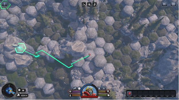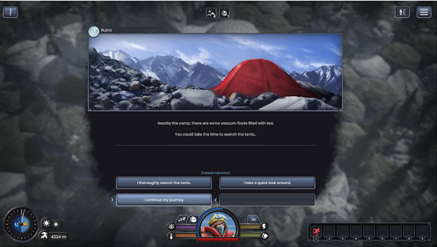 The terrain of the mountainous game world is built in hexagonal sections that you can travel across, which lends a unique board-game-like feel to the game. There are different kinds of tiles- snow, ice, and rock- which can affect aspects of the game such as how much energy it takes to traverse them or the speed at which you travel. Some tiles trigger different types of events when you walk across them, such as encounters with natives, discoveries of ancient shrines, or even dangerous rockslides. Each event is played out in an interactive text-based form. It feels a bit like reading a story- much of the imagery is left up to the player’s imagination, which can be fun, but also may not be appealing to every player.