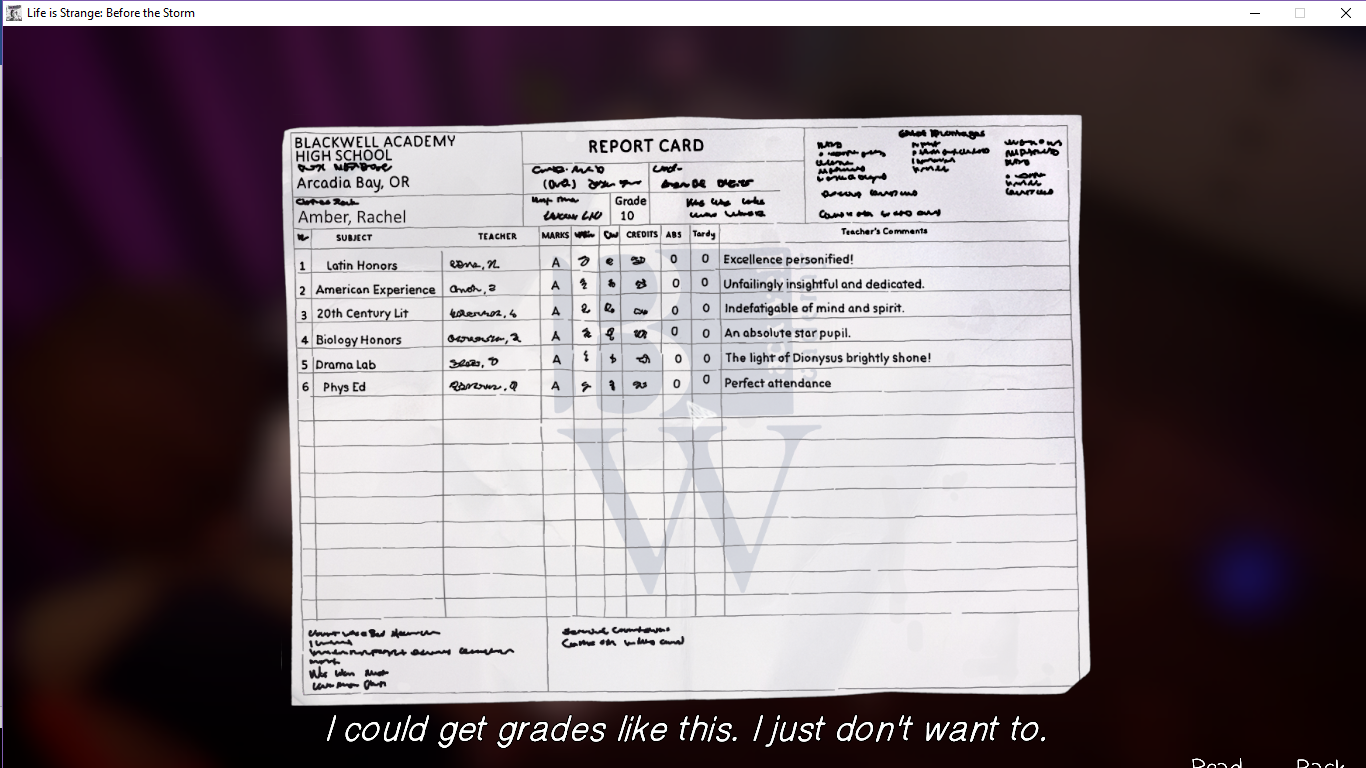 One of the reasons why Life is Strange feels so real and pulls you into the story is the incredible level of detail that pervades throughout the game. As with any good role-playing game, the characters’ mannerisms and speech patterns are distinct and lifelike. Even the background settings are extremely realistic: whenever you explore a new room, there is a plethora of items to look at, investigate, and interact with. One of the most impressive objects I observed was Rachel Amber’s report card, which Chloe finds in Rachel’s room. It was a fully detailed report, complete with grades, the names of different classes and teachers, and detailed teachers’ comments. The game developers clearly invested a lot of time in creating the virtual world of Arcadia Bay, and it paid off—I felt totally immersed and engrossed in Chloe Price’s life and story.