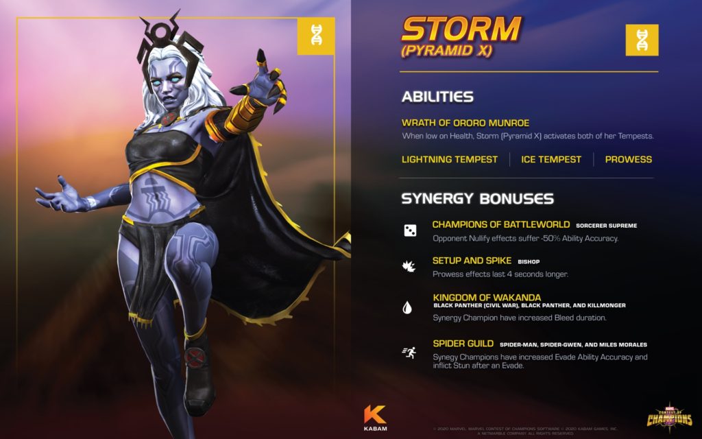 You can check out Storm (Pyramid X)’s Champion Spotlight, which details her abilities, history, strengths and weaknesses here: https://playcontestofchampions.com/champion-spotlight-storm-pyramid-x/