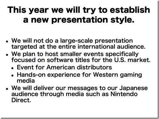Gaming Cypher 13 years ago In a financial results presentation today, Nintendo’s President, Satoru Iwata, announced that in this year’s E3, the company will hold smaller scale presentations. Below is Nintendo’s official blurb: What are your thoughts? Gaming CypherWeb | + postsBio ⮌This author does not have any more posts. Post navigation Previous Miiverse – Browser Access Now AvailableNext Age of Wusu Retail Edition Features Jet Li, Trailer More Stories Other Discover Eternitium: Time-Travel, Strategy, and the Race for Immortality 2 months ago Steven Reyes Other PlayStation Reviews BABY STEPS Review for PlayStation 5 4 months ago Nick Navarro Nintendo Other PC PlayStation Video Xbox 2K Releases Borderlands 4 Official Launch Week Trailer Plus Global Launch Times 4 months ago Galit Gordon