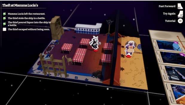 When it comes to mystery-solving, On Your Tail uses a combination of environmental clue-finding and a unique puzzle system powered by the Chronolens—a magical device passed down from Diana’s grandmother. The lens allows Diana to peek into the past at specific locations to spot changes in the environment. Clues are then collected and turned into cards, which you use in a board game-style diorama to reconstruct the crime.