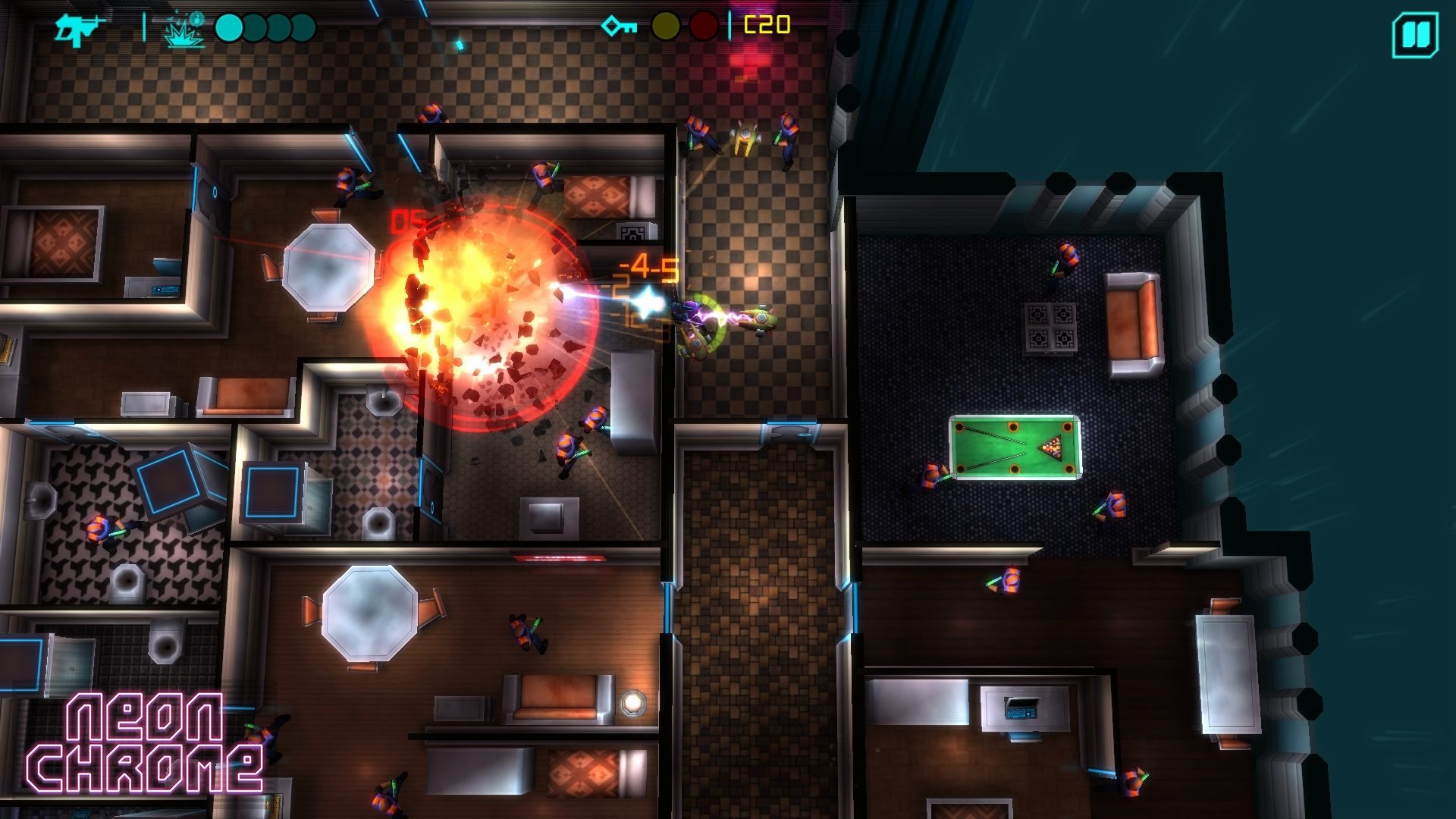 Neon Chrome is a colorful, top-down shooter game with many rogue-like elements. Set in a futuristic world, the player attempts to overthrow the dictator-like Overseer located in the highest floor of the Neon Corp skyscraper. You can choose from three different characters, randomized with each death, with different traits, attributes, weapons, and special abilities. Neon Chrome combines the shooter-style gameplay of Nuclear Throne and the upgrades and progression aspects of Rogue Legacy.