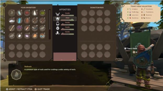 Speaking of gameplay, be prepared for a challenge because Pine doesn’t pull any punches. The simulation element comes in the form of the alliance and economy system with the five main tribes. While there is no in-game currency, the items and materials that are available around the island can be donated or traded to these groups. By doing so, you will raise your affinity rank with them and allow access to trade rare “ideas” they have available, which are essentially schematics that can be used to craft more items, weapons, and armor.