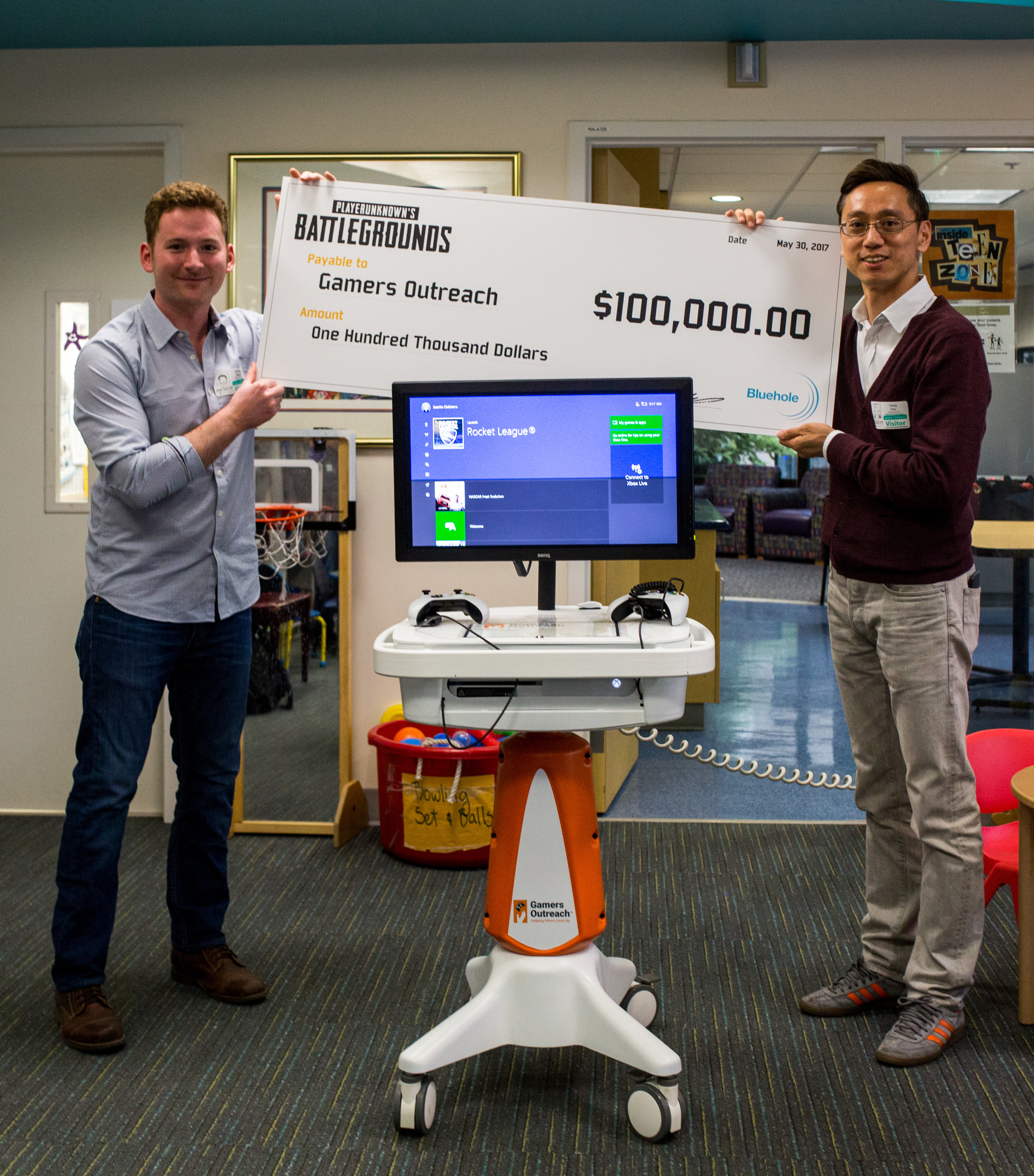 Seoul, South Korea – May 31, 2017 – Bluehole Inc. today shared in Gamers Outreach mission — to help hospitalized children cope with treatment through the power of video games and the gaming community. After a successful Charity Invitational for PLAYERUNKNOWN’S BATTLEGROUNDS, participants raised more than $123,000 for Gamers Outreach. Bluehole Inc. committed to matching those donations up to a total of $100,000 and Gang-Seok Kim, CEO of Bluehole Inc., presented the check for the full amount to Zach Wigal, founder of Gamers Outreach, in celebration of this important milestone.