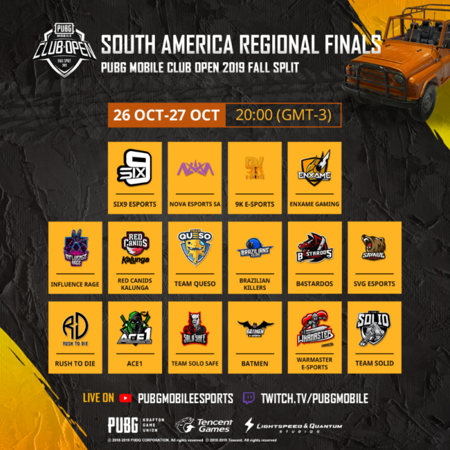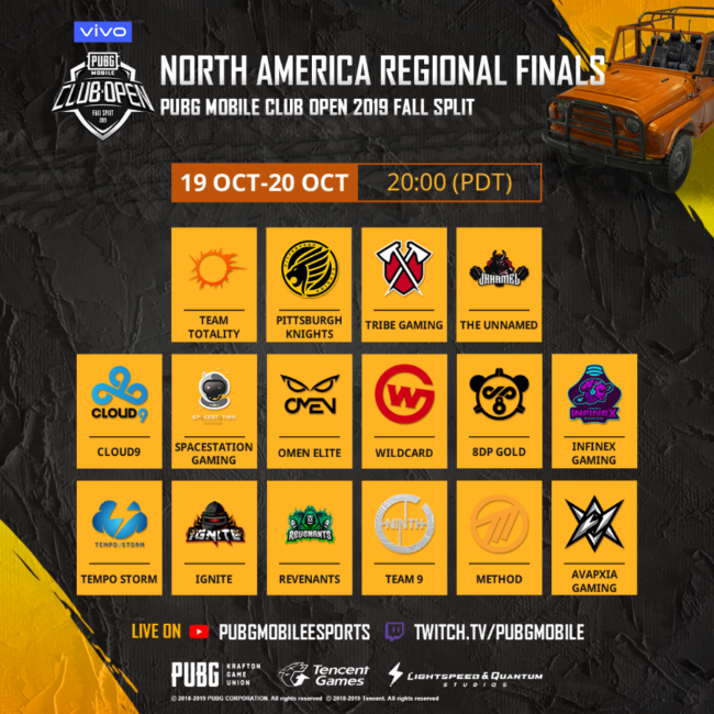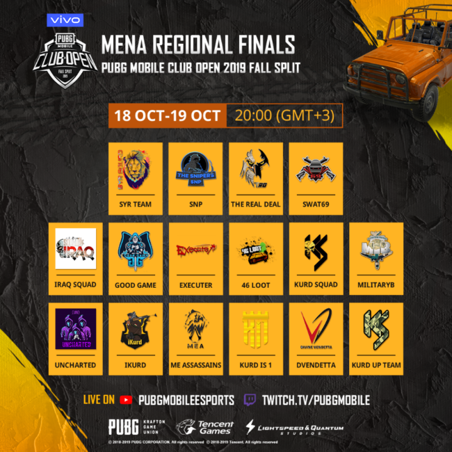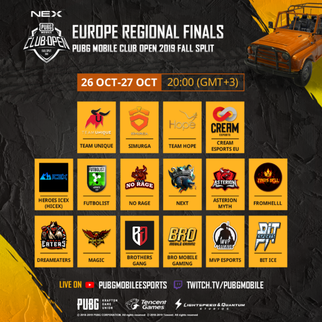 LOS ANGELES – Earlier this week, 32 squads from the Middle East, North America, South America, Europe, South Asia and Wildcard region dropped into the Semifinals stage of the PUBG MOBILE Club Open 2019 Fall Split. After days of all-out competing in the tactical tournament games, 16 teams rose to the top and secured their spot in the Regional Finals beginning on Friday, Oct. 18.