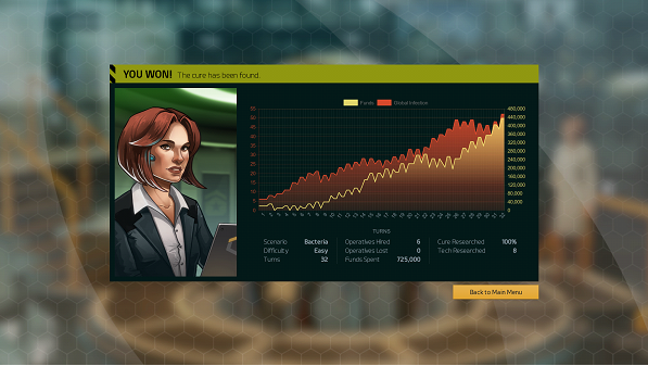 The gameplay begins with you picking an infected city to build an office in, and then hiring an operative. Offices bring in extra cash for you at the end of each turn and operatives are the characters whom you control throughout each game. Each turn, you can make an operative treat the infected population of a city, which slows the overall progress of the disease; set up a quarantine in a city, which prevents the disease from spreading in or out of that city; or collect samples of the disease within a city. Collecting enough samples allows the player to research traits of the disease, and when all traits have been researched, a cure is found and the player wins. Each action that the operatives can perform always has a slight chance at hurting that operative’s health, which can be healed with no consequences for a turn. Extra offices can also be built to increase the player’s cash flow.