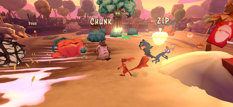 The band of squirrels must work together to develop strategies to outsmart the tree in order to scurry around and gather as many acorns as they can. Players select their squirrel character based on personality traits. Quick-witted Zip is the fast squirrel and has speed running abilities; gentle giant Chunk protects his friends by carrying a shield; Doug channels his rage issues to dig tunnels that allow for safe travel underground; and crafty Sim builds ramps for vertical movement.