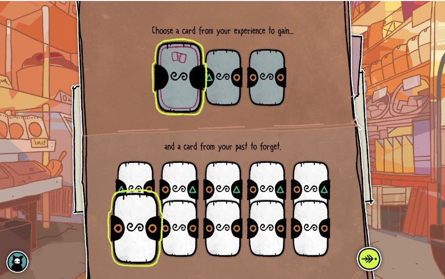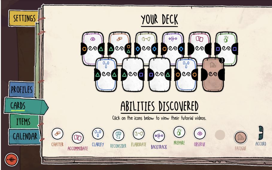 I think the game is really interesting in that your cards are your only way of communication. You use your deck of cards to forge positive conversations with characters (by matching the symbols up like in the picture) or negative ones (mismatching symbols). As you interact more with the characters, you learn new card skills and gain new cards that can help you have more positive interactions. Positive exchanges may cause the characters to give you items but it’s up to you how you want to interact or really how your deck plays out. Towards the end, I kept getting negative exchanges because my cards never matched – I had too many fatigue cards.