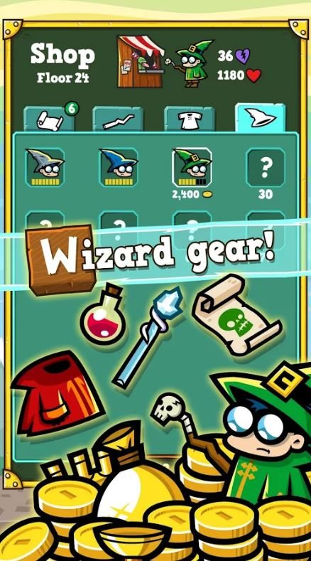 - Collect gold and buy better items between levels