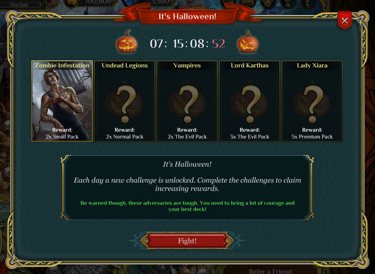You will notice that a certain grinning pumpkin has appeared on the world map. Click on it! Each day, starting October 25th, a new special Halloween Challenge will be unlocked. Complete all challenges until November 2nd to get great rewards, but keep in mind those Evil adversaries are tough – bring a lot of courage and your best deck!