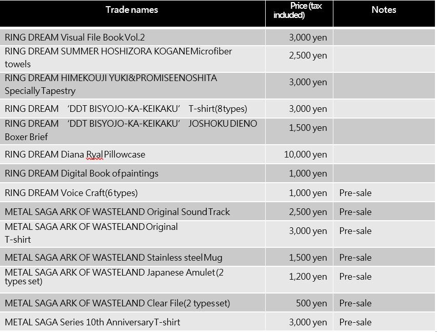 At the booth, SUCCESS will start selling ‘RING DREAM Voice Craft‘ (A paper doll product with voice coming out of it) and will also offer ‘METAL SAGA ARK OF WASTELAND’ merchandise