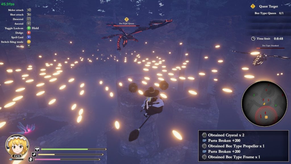 Now for the meat and potatoes! Touhou Mechanical Scrollery is an ambitious take on the Bullet Hell genre. It breaks away from the constraints of 2 dimensions and ascended towards a new stage in evolution. For that, it should be commended. It also retains all the elements of a popper game of its genre and is never short of energy blasts or particles that fill up the screen. This is what the developers got right. Combat and movement, however, would have benefited from far more polish. There are two basic attack types: Melee and Shooting, both of which strongly lean on the lock-on mechanic of the game. While in assault mode, you can both melee and shoot at the same time. Melee attacks, however, are nearly impossible to control and you are guaranteed to miss at least 25% of your combo. You are going to also find yourself adjusting your altitude as well since you’re always flying on your broomstick during gameplay. Shooting is easier. The bullets lock on and seek out the enemies for you, plus you have a Sniper mode that, while it deals more damage per second, isn’t all that necessary. The main advantage is you can selectively target body parts on the enemies to break off and farm upgrades, but you can do this effectively enough with basic melee and homing shots. There are some RPG and crafting elements in the game, but they only serve to encourage you to farm the repetitive levels so you can create weapons with different “Ultimates.”
