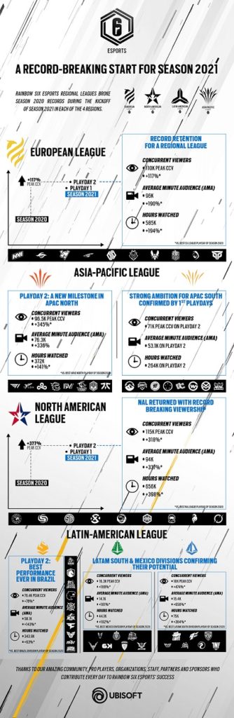 Tom Clancy’s Rainbow Six eSports broke Season 2020 records during the kickoff of Season 2021 across all four regions: the European League, Asia-Pacific League, Latin-American League and North American League
