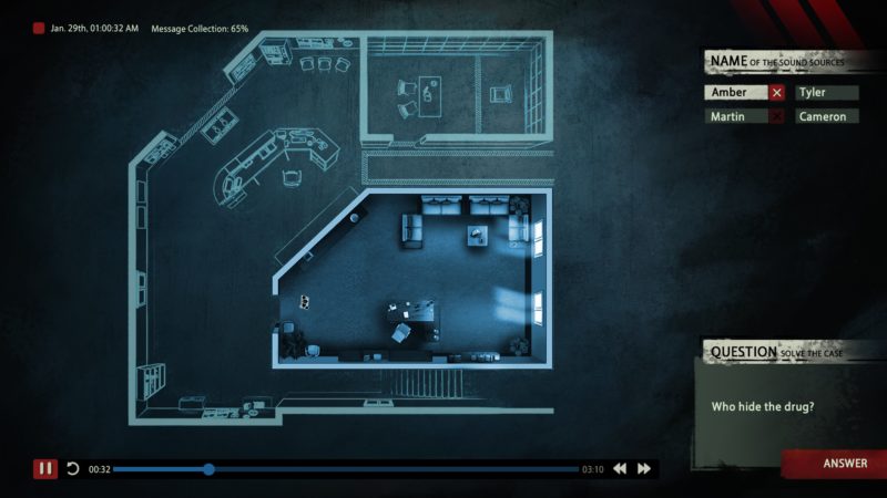 Unheard puts players in the role of a time-traveling detective who is only able to use one sense, sound. The game’s story is a non-linear experience. Players will not always experience the crime from start to finish but instead must build their own timelines from the clues in conversations they overhear. The game simulates the real world in real time, so while players are in one room, other conversations, actions, and perhaps more sinister endeavors may be occurring elsewhere.