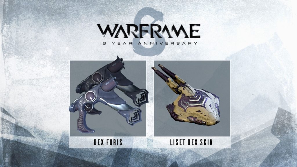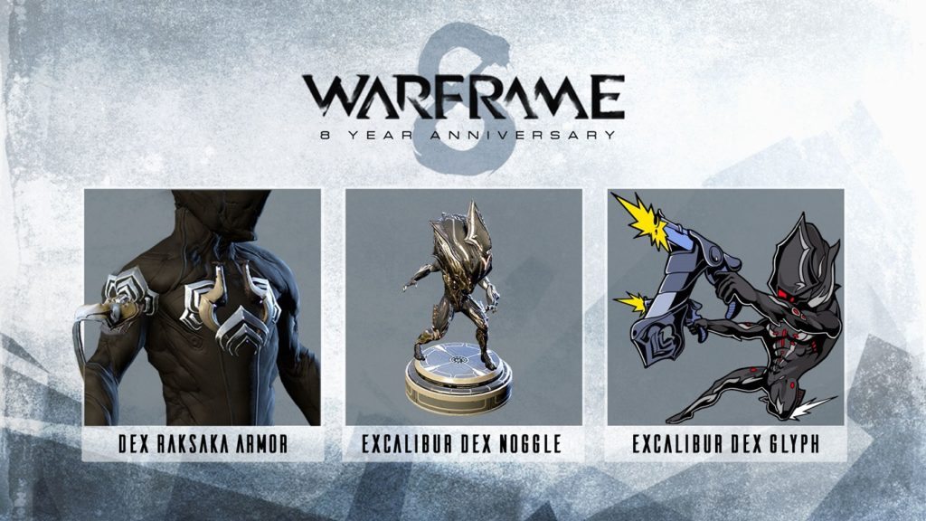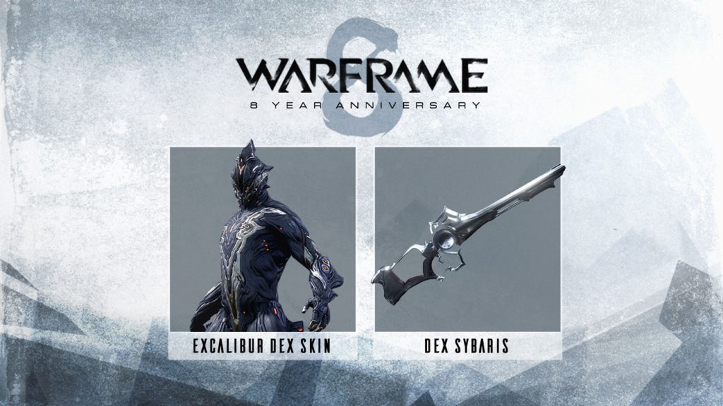 Log in now for your free Dex Rhino Skin, play in style with new fashion frame accessories, track the weekly Alerts to grab previous anniversary offerings, and have fun! Visit the 8-Year Anniversary site: www.warframe.com/anniversary
