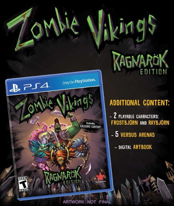 Los Angeles, CA– April 22, 2016 – Rising Star Games and developer Zoink Games have announced today an onslaught of putrid pugilism on PlayStation 4 computer entertainment system, with the launch of the physical boxed release of Zombie Vikings Ragnarök Edition, for $19.99. From acclaimed Swedish developer Zoink Games, Zombie Vikings Ragnarök Edition features five exclusive arenas, two additional player characters and a deluxe digital art book.